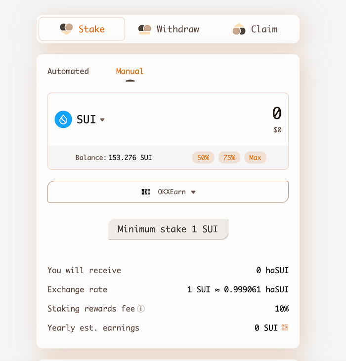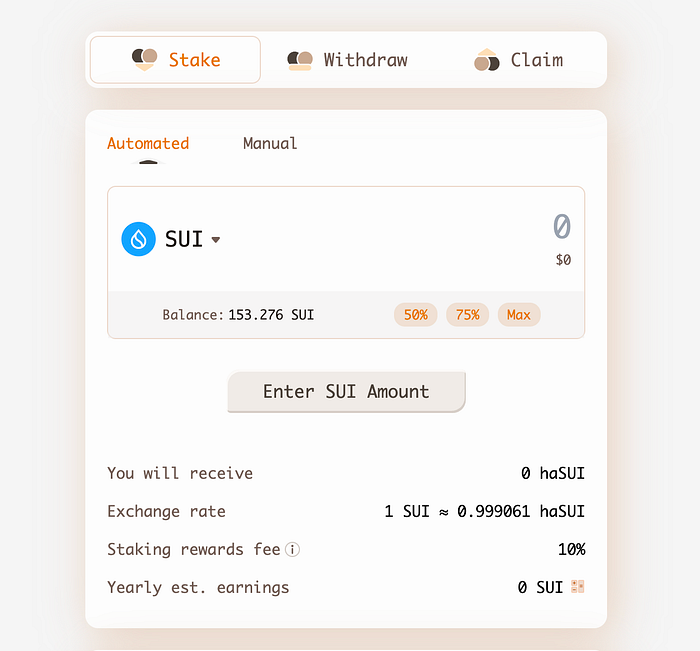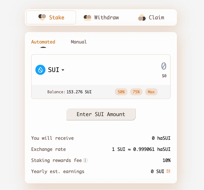 3. There are two modes for users to choose — ‘Automated’ & ‘Manual’. ‘Automated’ mode allows users to stake their SUI/Native staked SUI on Haedal at one click with the most efficient validators suggested by Haedal. Enter the amount of SUI to stake and get haSUI in return.
